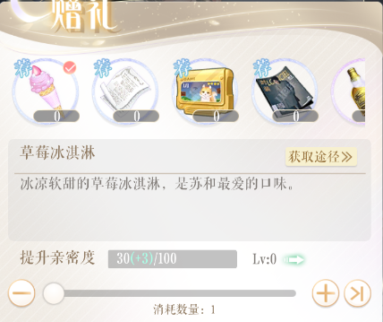 要想尽快获得缘定者的好感与支持,投其所好是重点,每一个缘定者都有自己的兴趣爱好,根据缘定者的兴趣爱好赠送对应道具,比如我们的缘定者苏和最喜欢吃的就是草莓味的冰淇淋了。