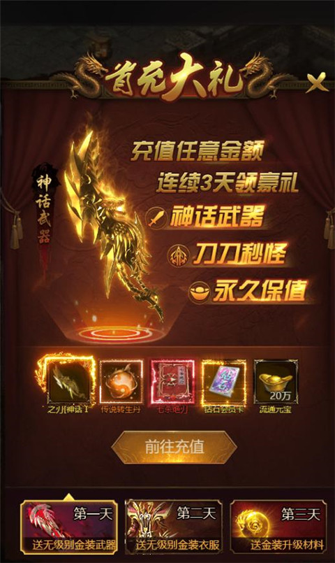 2、首次充值任意金额即可获得神话级武器,提供强大战斗力支持,帮助玩家快速提升角色实力。