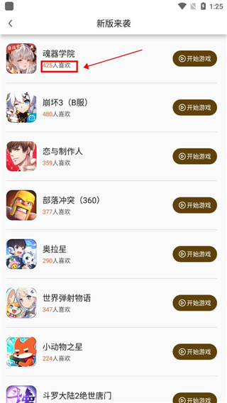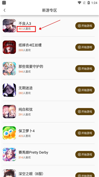 5、选择“新游专区”可以看到最近新出的一些游戏,还能在看到有多少人喜欢该游戏;