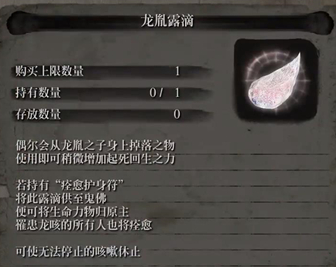 1、治愈“龙咳”需要使用“龙胤滴露”,该药品可以在游戏内的商人处购得,价格为每个180金。