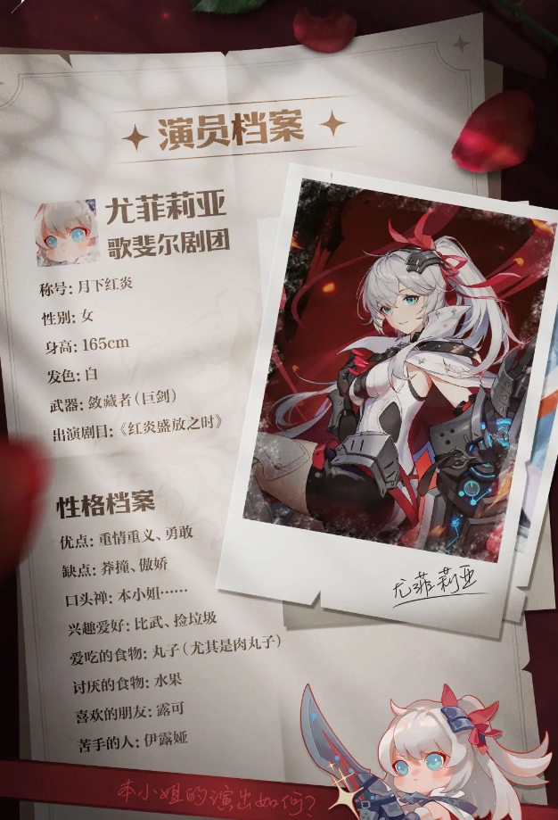 战心职业当中有两个代表性的人物,一个是尤菲莉亚,她是月下红炎,在设定上盖角色重情重义,而且非常勇敢,性格方面有点莽撞,也有些许的傲娇,非常喜欢吃丸子类型的食物,有一个好朋友是露可,可以作为输出来使用的一个角色。