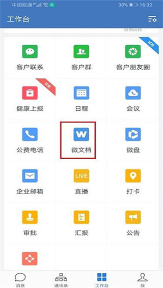 1、手机上打开企业微信,进去工作台,点击微文档,如下图所示:
