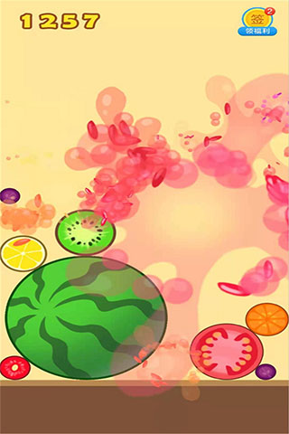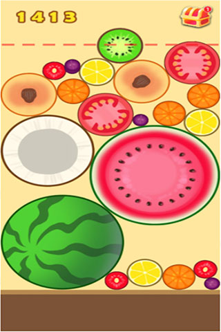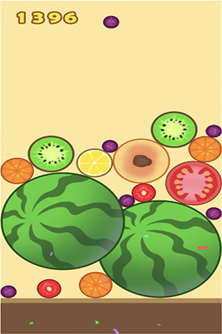 3、当相同种类的水果相互碰触时,无论是从哪个方向,它们就会融合成一个尺寸更大的水果。在这连锁反应中,最后形成的最大水果便是西瓜,这一点与 2048 游戏类似。