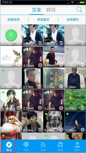 2. 登录成功后,进入主界面,即“身边”页面。在此,可浏览推荐的附近朋友信息。用户可通过筛选器、排序和视图模式进行个性化设置。