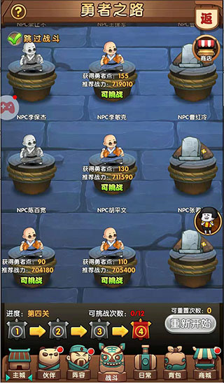 进入乌龙院之活宝传奇手游最新版后,定位至勇者之路图标。在这里,玩家的主要任务是攻击小和尚,以赢取勇者点数。但并非随意攻击,因为可挑战的小和尚难度不同,有些相对较弱,容易击败。