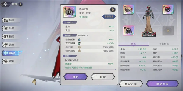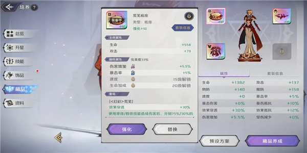 私藏品方面,作为输出核心的迪米乌哥斯需要携带能够提高其输出能力的藏品,如带有效果穿透以及附带负面效果(包括灼烧)的【荒芜】套装,或提供攻击加成和额外伤害加成的【猩红】套装以及【断罪】套装等。雅儿贝德和尼亚携带能够强化输出的【迅雷】、【猩红】或【荒芜】均可。卡吉特作为祭司,可以携带能提高治疗量的【煅火】套装,或提供技能冷却的【绿魇】套装。