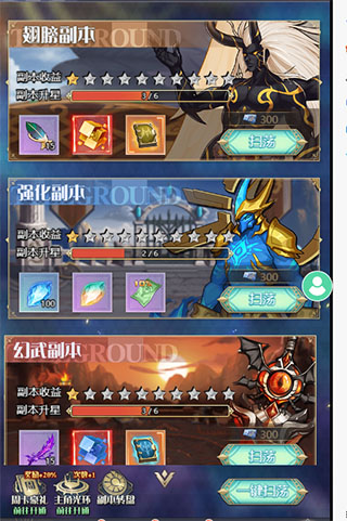 翅膀副本、强化副本、幻武副本、光环副本、圣物副本、光影副本、御兽副本、神器副本(需达到一定条件才开启)