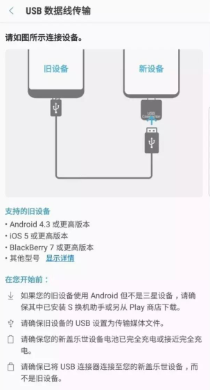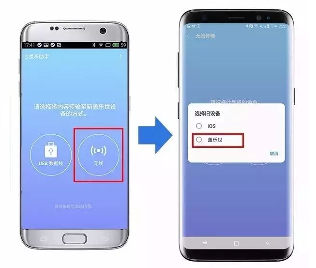 1、下载并安装app,打开后根据情况选择操作系统和传输方式,推荐使用无线传输,下面以无线传输为例其中,Galaxy S7/S8默认装有,点击【设置】-【云和账户】-【助手】打开即可。