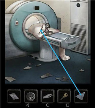 使用石头砸破镜子,地上捡起玻璃片,再回到检查室使用。