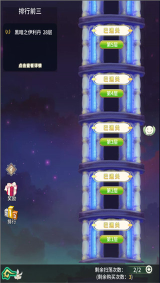 每一层首次挑战不消耗次数,已通关层可进行扫荡,每天有2次免费扫荡次数;