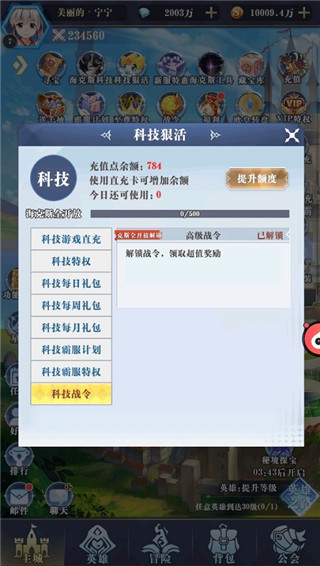 1、新手引导进入游戏后需要根据游戏内的引导指示领取上线福利和升级海克斯特权领取科技狠活额度,线福利领取后可获得一个10星神将和大量的升级材料和货币,英雄召唤结束后即可进入冒险界面挑战