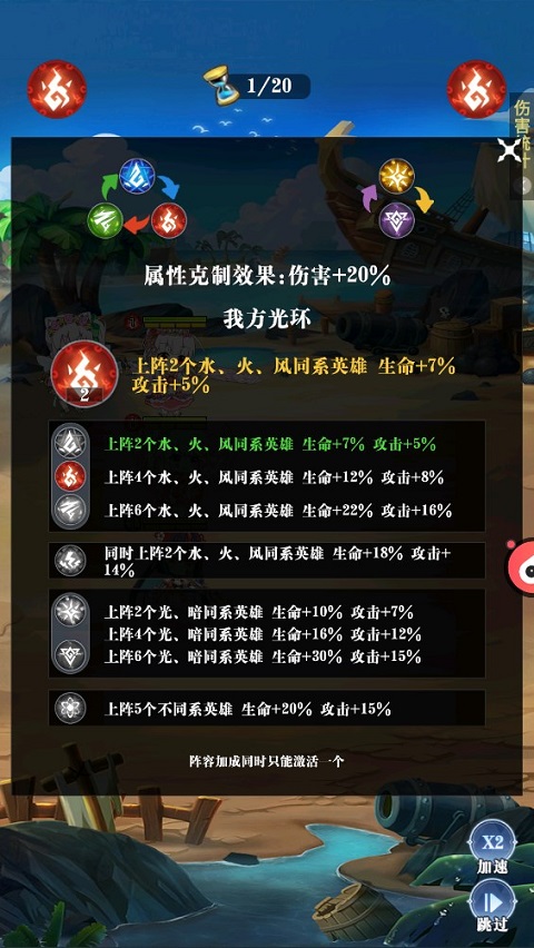 同时上阵2个水、火、风同系英雄,生命+18%,攻击+14%。