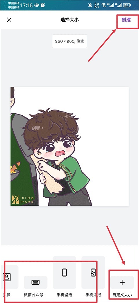 3、在相册中选择照片,调整大小后点击创建。