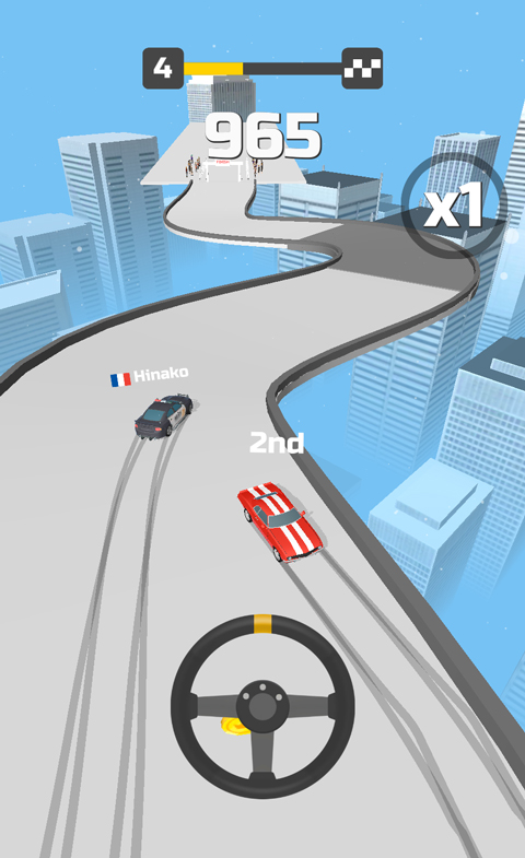 2、通过滑动屏幕中央的方向盘控制赛车,在赛道上漂移;