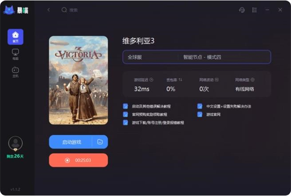 因为《维多利亚3victoria3》的服务器没有在国内,对网络要求比较高,可以用下面的加速工具对网络进行优 化,优 化后再启动游戏即可成功进入。能够帮助玩家降低延迟,解决游戏过程中掉线、卡顿、延迟高、加载慢等问题。