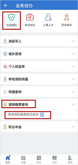 3、登录业务经办,选择“社会保险”-“城保缴费查询”-“养老保险缴费情况查询”;