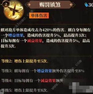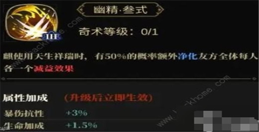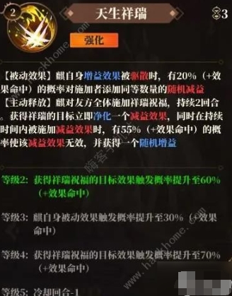 三技能:麒的核心技能,但是目前有BUG(祥瑞祝福状态吃麒的效果命中,实际上没实装)所以高命中麒就算开出技能也可能挡不住对方施加的DEBUFF和控制效果。实测在生效情况下可以净化夔牛在队友行动回合开始的嘲讽。