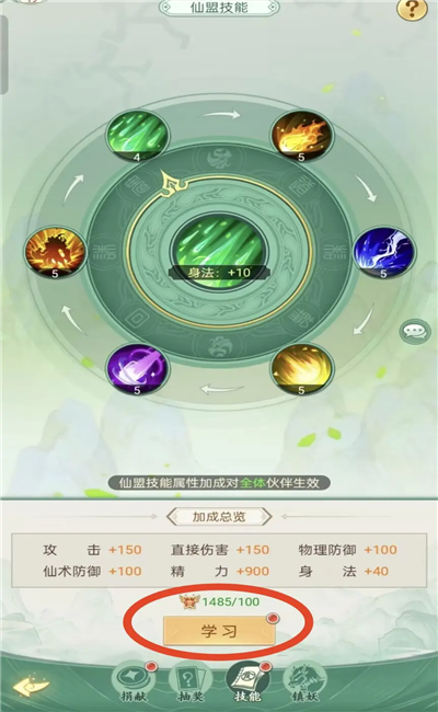 ① 优先点仙盟技能(位置在仙盟-仙盟事务-技能)