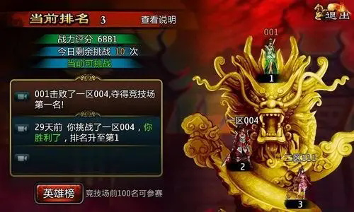 完成70级主线任务后,每个服务器竞技场前100名玩家皆可参加跨服英雄榜挑战。