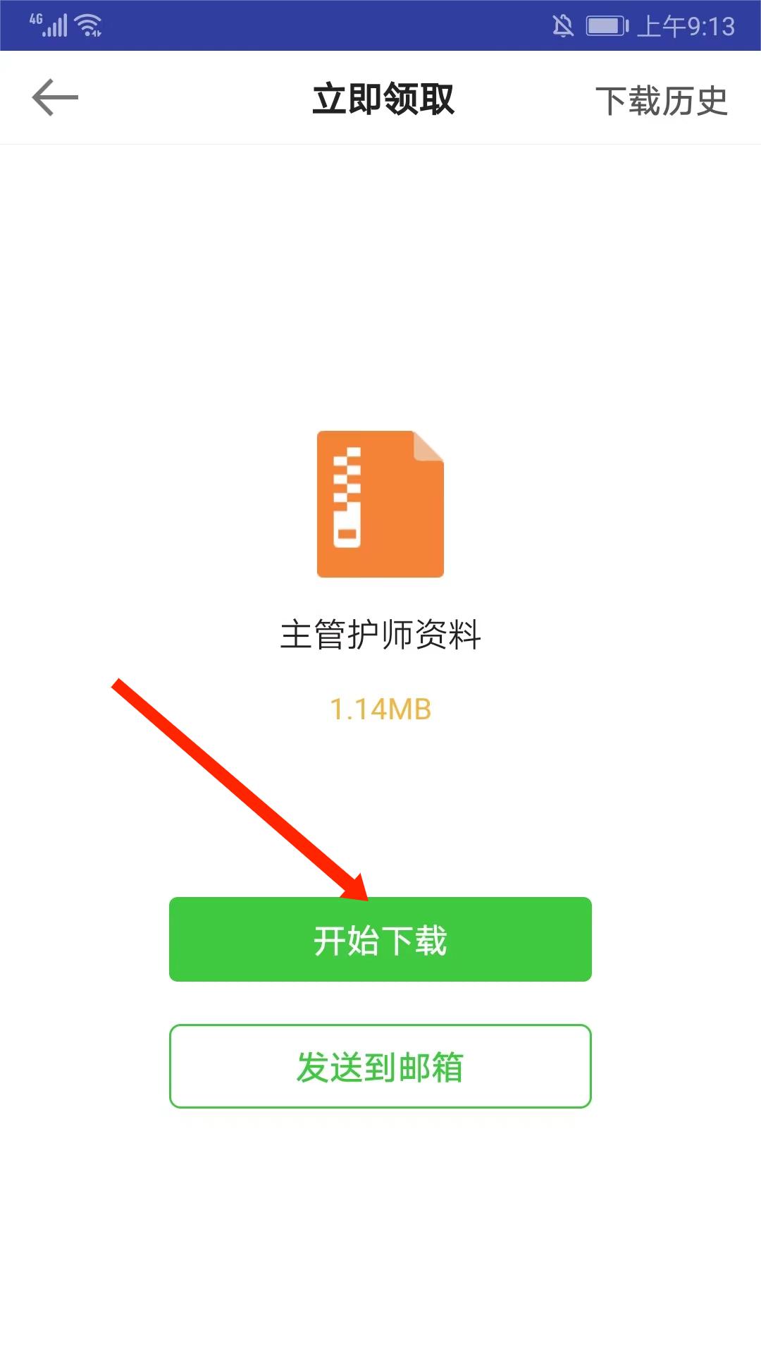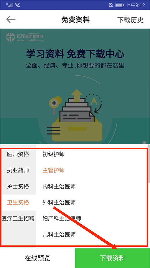 4、选择相应科目如“卫生资格”中的“主管护师”,然后选择“下载资料”。