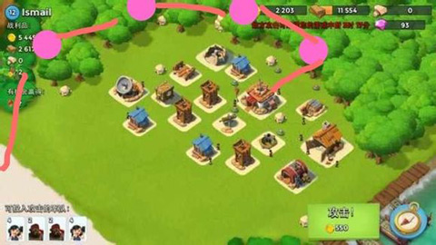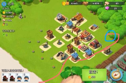 例如,这位玩家的大部分防御建筑都在前方,大本营后无防御,可以使用胖子搭配mm沿红线路径,避开所有防御,直接偷袭大本营。
