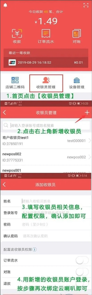 4、支持多收银员账号添加:点击【收银员管理】,选择新增,填写信息并设置权限。