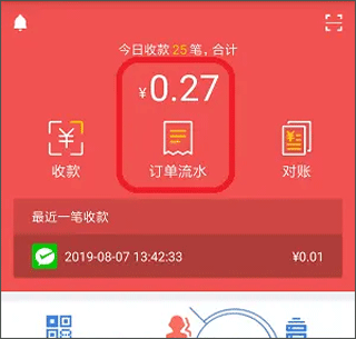 3、支付成功后,app端会自动播报收款成功通知,并显示实时余额变动。商户还可以查看【订单流水】以确认交易状态。