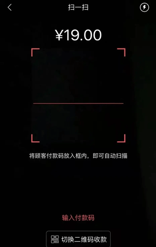 2、收款方式灵活:顾客可直接扫静态码;商户可通过【收款】【扫一扫收款】进行反扫收款;或选择【收款】【切换二维码】进行动态码收款。