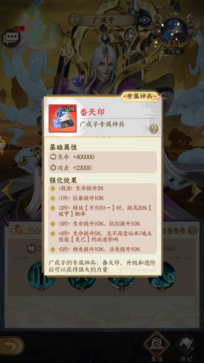 广成子专属:番天印基础属性:生命+40w,攻击+2w2