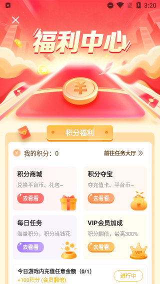 福利中心:用户参与即可获得积分奖励,积分可兑换平台币、充值卡等,支持游戏充值