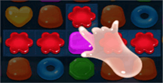 交换相邻两个糖果的位置,使5个颜色相同的糖果形成“T”、“L”或“+”型,会在交换点处形成一个特殊效 果。再次在该特殊效果上进行消除会消除掉一整行和一整列的糖果。