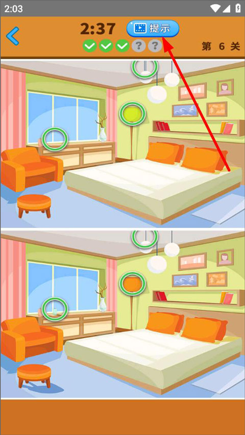 如果难以找到差异,可以使用游戏顶部的提示道具来帮助通关。