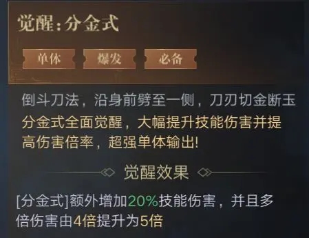 思路1:只携带二转的三个主动技能+普攻技能分金式,可以稳定给目标附加流血状态,确保提升技能伤害;