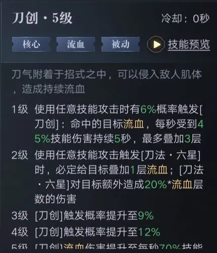 任意攻击12%概率触发流血,每秒造成45%技能伤害,对流血目标额外造成最高3层*20%即60%的伤害,触发刀法六星时,则必定触发流血效果。