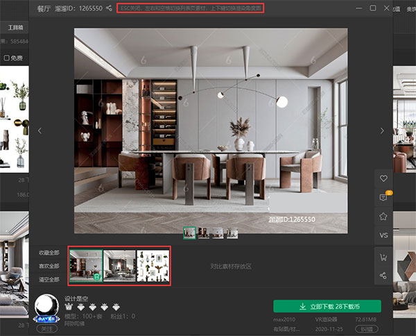 4、多样化整理工具,提升使用效率通过对比工具,可以先行对选择难定的素材进行对比分析,然后再决定下载。在浏览素材时遇到心仪之物,可以先标记为“喜欢”,待后续通过“喜欢”筛选找回。收藏功能更直观,还可以在淘模中查看共享收藏,实现一键复制他人收藏夹到个人库中。