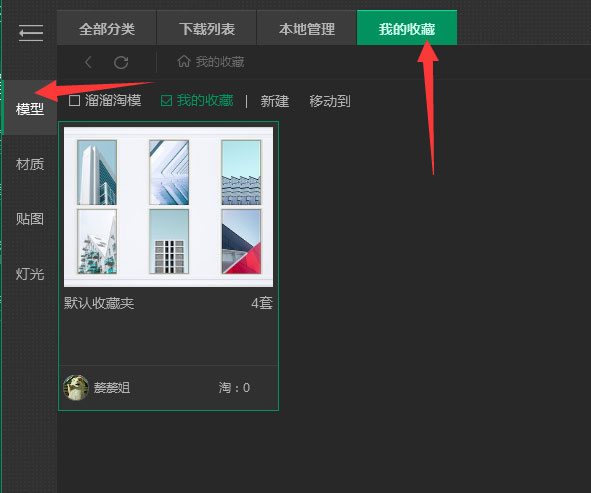 如何查看指定类型的收藏素材:想要查看指定类别的收藏素材,只需点击溜云库左侧的分类按钮。例如,查看模型收藏,点击【模型】;若要查看材质收藏,则点击【材质】。