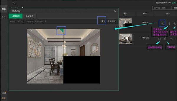 最后一步,确认任务已经成功提交到溜云库客户端。- 任务状态变更为:正在上传—准备渲染—渲染中—渲染完成,如图所示。