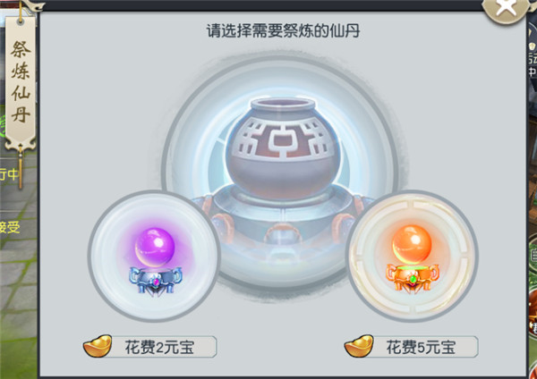 每日可参与祭炼仙丹2次,获得大量经验,可选择花费2元宝/5元宝进行祭炼,可使用绑定元宝