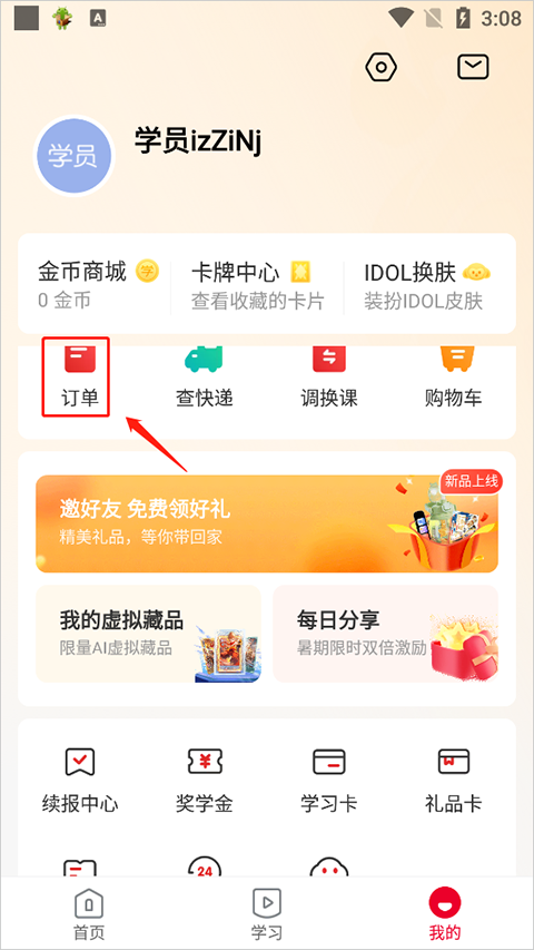 再进入您的个人信息页,从那里点击“订单”这一功能键。