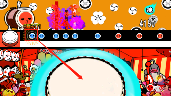 4、游戏玩法:注意屏幕下方的黑色圈圈,圈中为鼓面,需点击敲击。