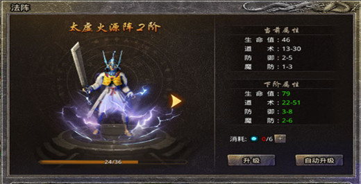 1、法阵一共16阶等,可通过消耗阵法之灵来提升,每提升1阶都会获得多种属性提升