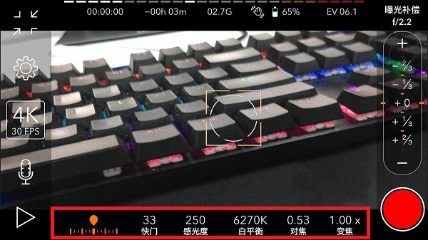 4、在界面下方,可以修改快门、感光度、白平衡、对焦和变焦等多项参数