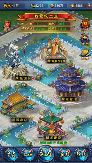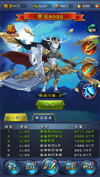 在已有的帮派系统界面中,有帮派佣兵、帮派建设、帮派管理、帮派商店以及新增的帮派BOSS五个功能,帮派BOSS功能位于最顶端,点击进去后便可以进行挑战,每个玩家每天有3次挑战机会。帮派BOSS拥有3个天赋,3种天赋会每日随机出现,玩家可以适当根据BOSS出现的天赋来调整阵容,从而打出最高伤害……