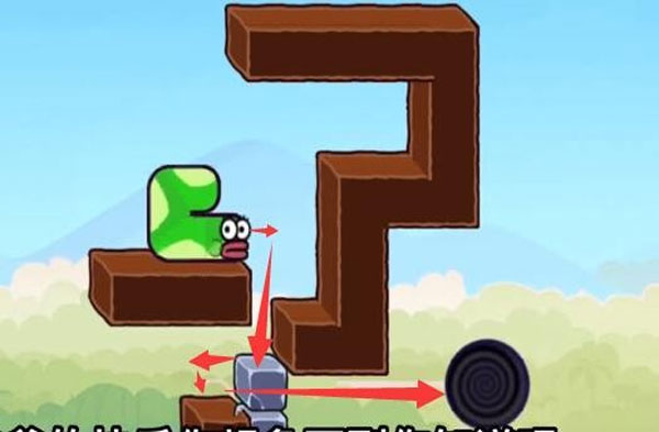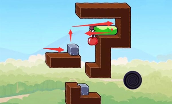 1. 如图所示,首先控制贪吃蛇,利用左侧的石头和苹果推动右侧的石头下落,然后吃掉苹果。