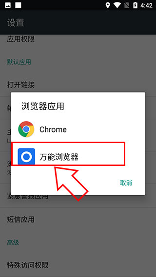 5、在浏览器应用设置中选择“万能浏览器”作为默认浏览器。