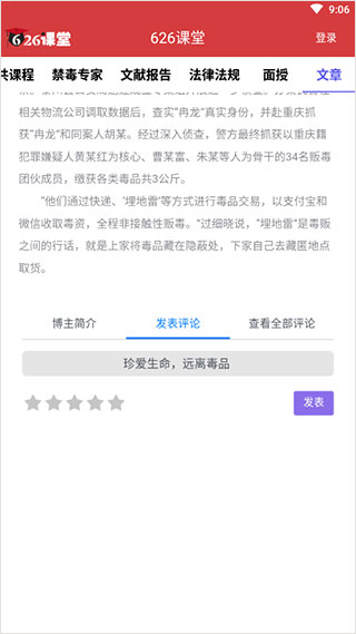 626课堂禁毒平台拥有多样的教育内容,包括实时更新的文章、国内外的毒品防范知识,以图文形式进行通俗易懂的讲解。通过观看各种正能量视频,用户不仅能增强自我保护意识,还能帮助年轻一代健康成长。这个平台为所有关心禁毒教育的用户提供了一个学习和交流的良好环境。如果你对此感兴趣,下载并使用626课堂禁毒平台吧!