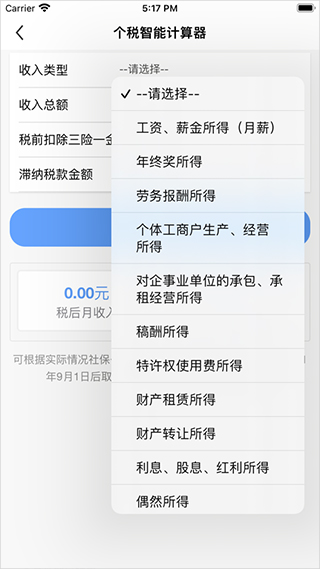 3、应用中还配备了个税智能计算器,可根据不同的收入类型计算个人所得税。