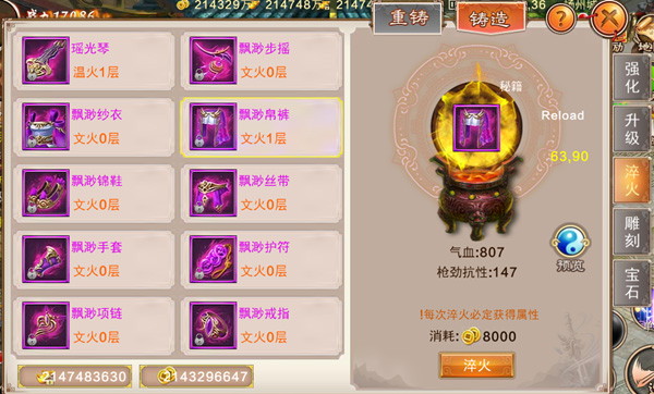 装备成长分为8类:强化/升级/淬火/雕刻/宝石/重铸/品质/神装。