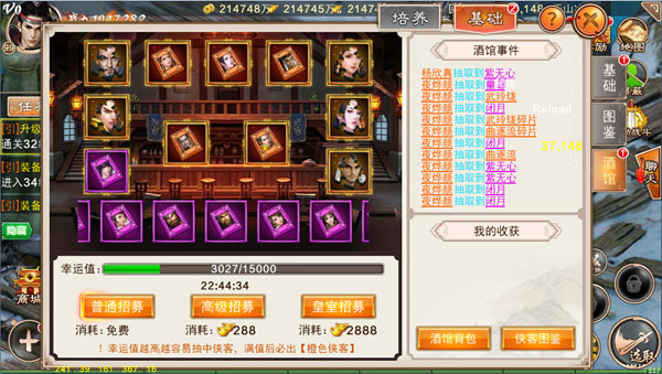 通过游戏中的酒馆,你可以招募各色侠客。每次招募都会增加幸运值,当幸运值满时,你可能会遇到江湖中的传说级高手。