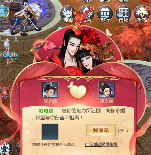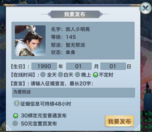 在情缘大厅内,玩家可以发布征婚信息,浏览其他玩家的宣言。通过送花、私聊提升亲密度,达到520后,可以发起求婚。